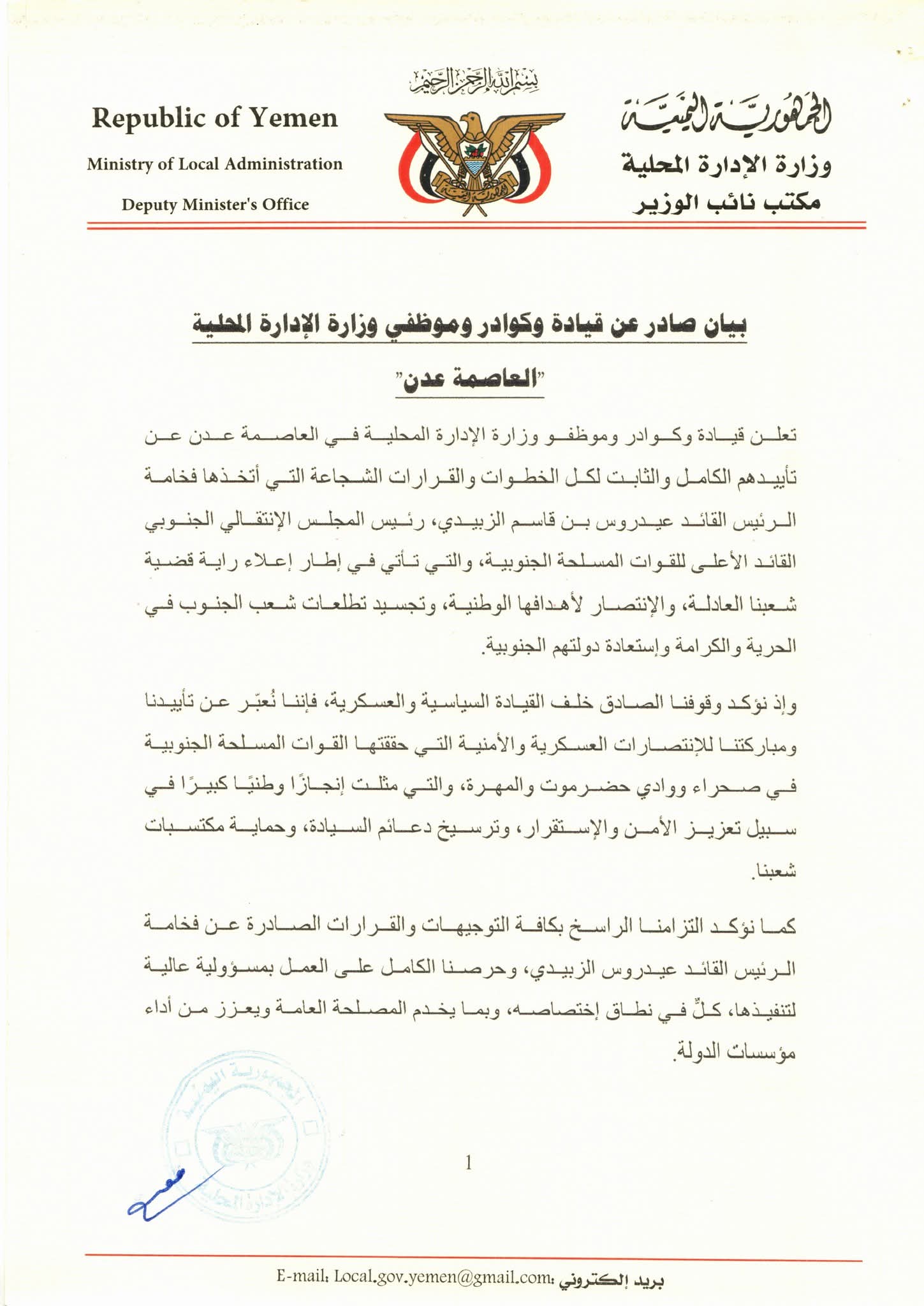 أعلنت وزارة الإدارة المحلية تأييدها الكامل لخطوات المجلس الانتقالي الجنوبي والقوات المسلحة الجنوبية الرامية إلى إعلان دولة الجنوب العربي، مؤكدة دعمها لكل الجهود الوطنية الهادفة إلى استعادة الدولة وبسط السيادة وتعزيز الاستقرار.