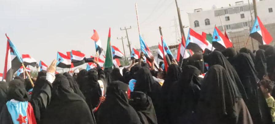 رفعت الحشود النسوية المشاركة أعلام دولة الجنوب وشعارات وصور الرئيس القائد عيدروس الزبيدي تطالبه بإعلان دولة الجنوب العربي.