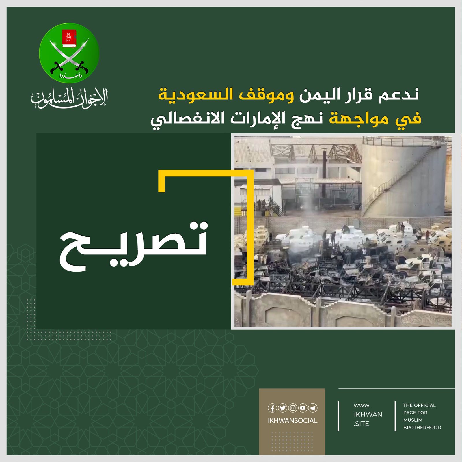 وهاجم بيان الإخوان دولة الإمارات العربية المتحدة، متهمًا إياها بتغذية “النزعات الانفصالية” وتسليح أطراف خارج إطار “شرعية الدولة”، وذهب إلى ربط ذلك بساحات إقليمية أخرى، داعيًا أطرافًا عربية ودولية بينها مصر والجامعة العربية ومنظمة التعاون الإسلامي والأمم المتحدة لاتخاذ ما سماه “قرارات رادعة” ضد “التوجهات الانفصالية”.