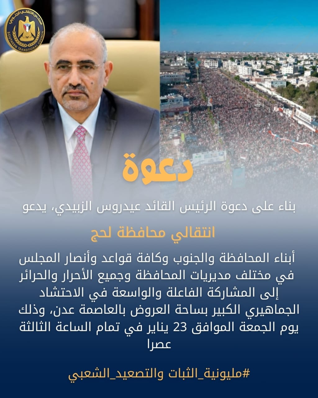دعت القيادة المحلية للمجلس الانتقالي الجنوبي بمحافظة لحج إلى حشد جماهيري واسع والمشاركة الفاعلة في مليونية **"الثبات والتصعيد الشعبي"**، استجابةً لدعوة الرئيس القائد عيدروس قاسم الزُبيدي، رئيس المجلس الانتقالي الجنوبي، القائد الأعلى للقوات المسلحة الجنوبية.