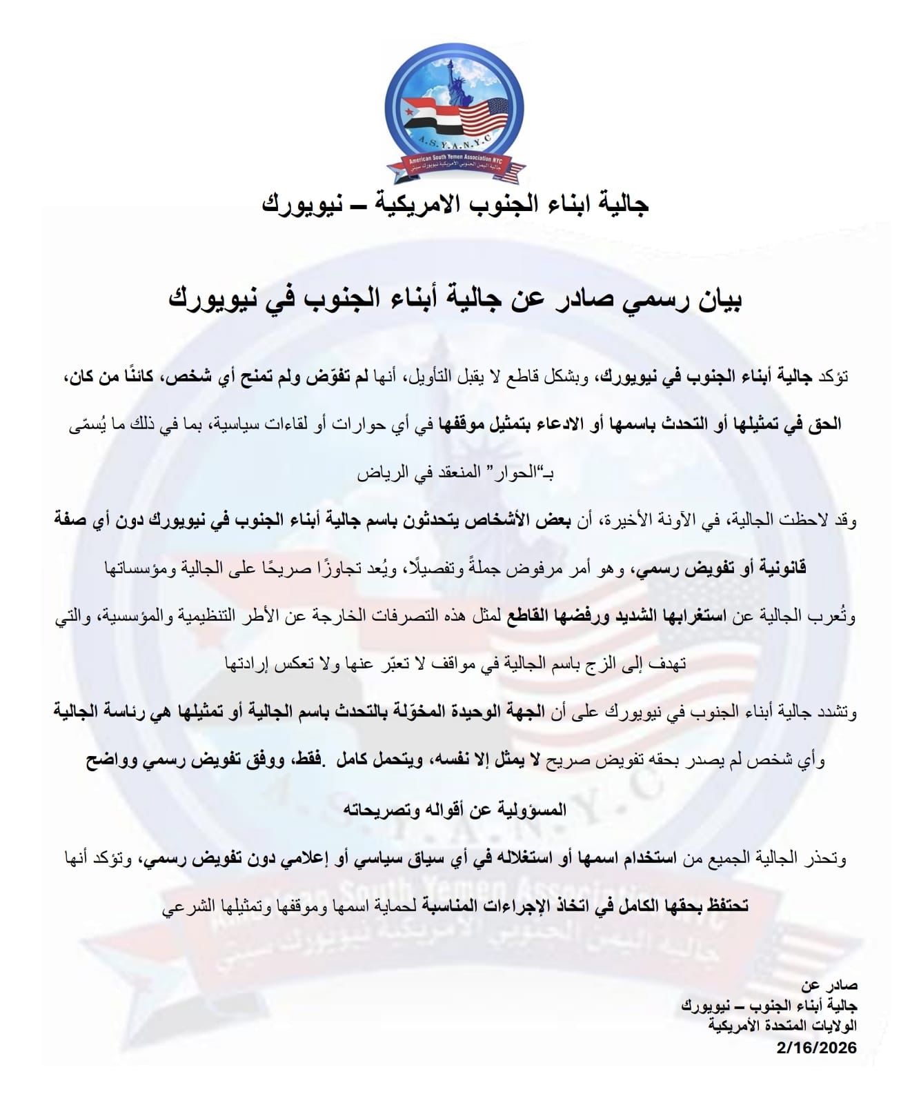 أصدرت جالية أبناء الجنوب في مدينة نيويورك بالولايات المتحدة الأمريكية، بياناً رسمياً هاماً، نفت فيه بشكل قاطع منح أي تفويض لأي شخص أو جهة لتمثيلها أو التحدث باسمها في أي حوارات أو لقاءات سياسية، وخصّت بالذكر ما يُسمى بـ "الحوار" المنعقد في العاصمة السعودية، الرياض.