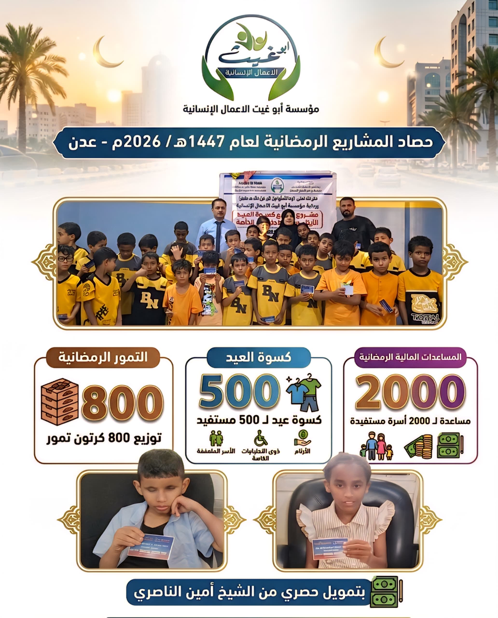 ونفذت المؤسسة خلال الشهر الفضيل ثلاثة مشاريع إنسانية متتالية، حيث دشنت برامجها بتوزيع 800 كرتون من التمور في مطلع شهر رمضان، قبل أن تطلق مشروع “كسوة العيد” الذي استفاد منه 500 شخص من فئات الأيتام وذوي الاحتياجات الخاصة والأسر المتعففة، واختتمت المؤسسة أنشطتها الرمضانية في العشر الأواخر بتنفيذ مشروع المساعدات النقدية المباشرة الذي استهدف 2000 أسرة في مختلف مديريات عدن.