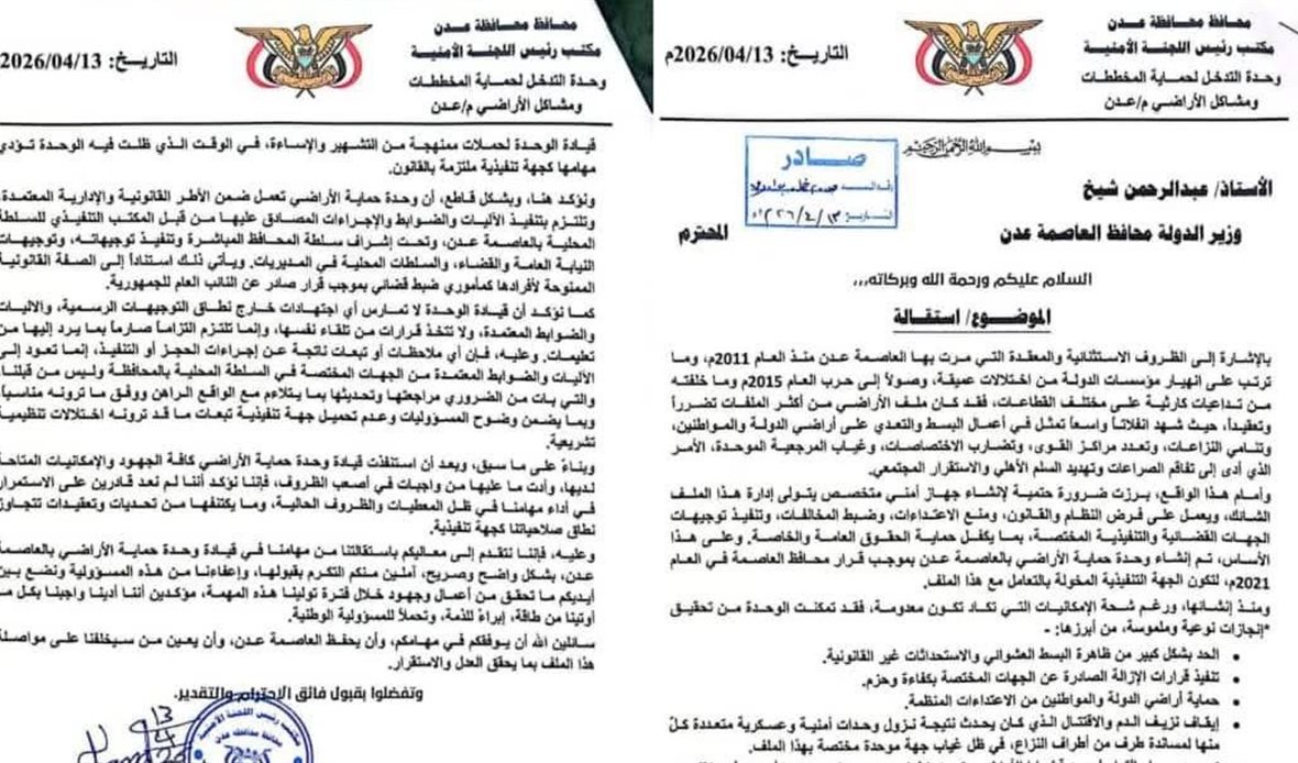 أعلنت قيادة "وحدة حماية الأراضي" في العاصمة عدن، اليوم، تقديم استقالتها الرسمية من مهام عملها، واضعةً حداً لمسيرة امتدت لأكثر من خمس سنوات من مواجهة عصابات الأراضي وهوامير الفساد
