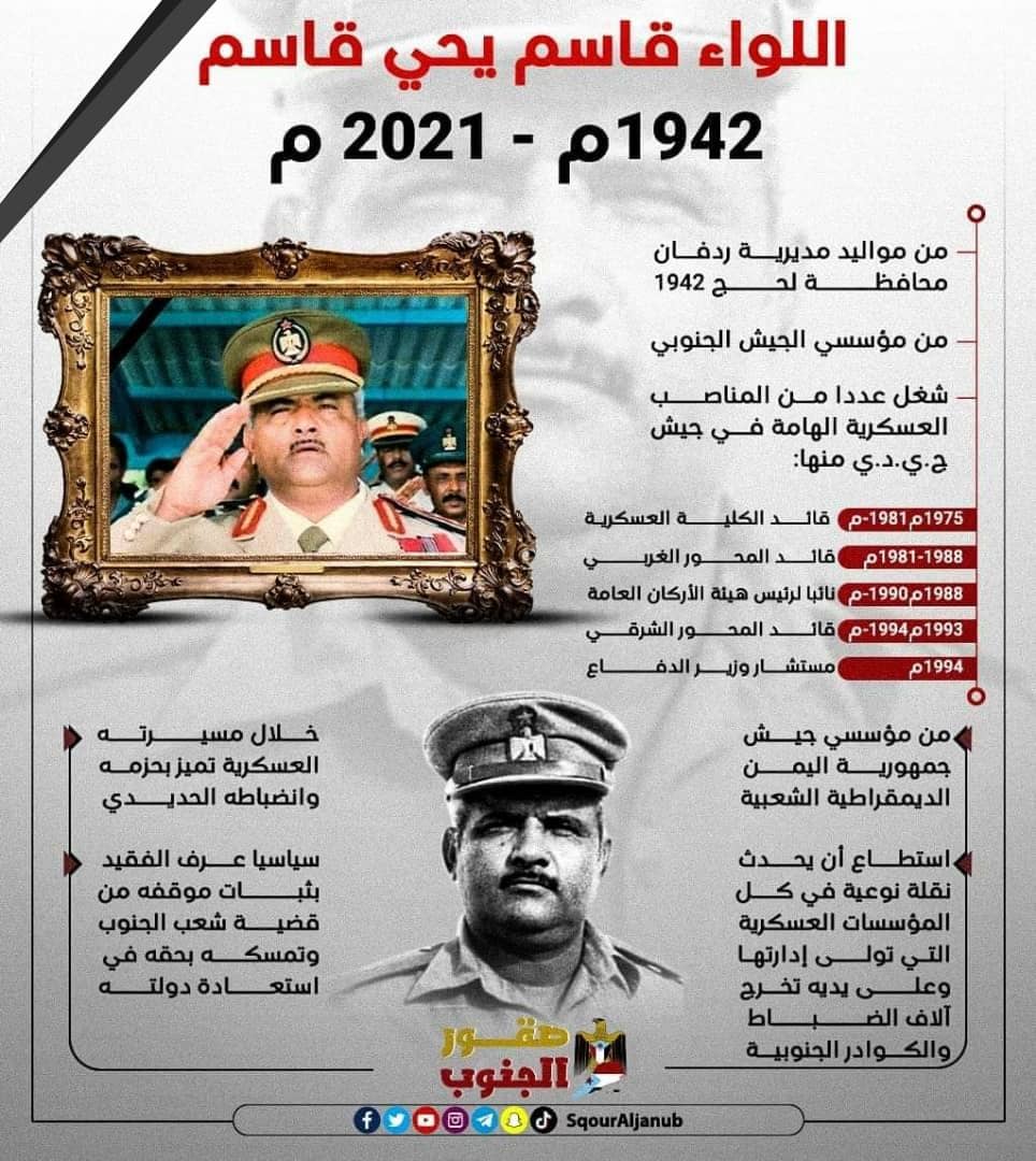 بعث معالي وزير النقل الدكتور عبدالسلام صالح حُـميد ، ببرقية عزاء ومواساة بوفاة اللواء قاسم يحيى قاسم محسن نائب رئيس هيئة الأركان العامة في الجيش الجنوبي سابقاً ، والذي وافاه الاجل ، اليوم الاثنين ، وانتقل إلى جوار ربه ، بعد حياة حافلة بالعطاء والتضحية والنضال.